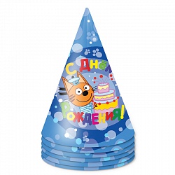 Праздничный колпачок из бумаги с любимыми персонажами мультфильма “Три Кота” поможет создать веселую и  беззаботную атмосферу праздника и станет забавным атрибутом костюма для гостей торжества.