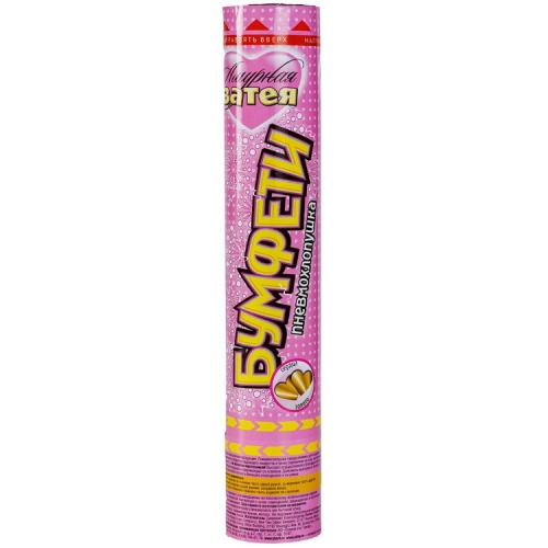 Пневматическое устройство, аналог хлопушки, абсолютно безопасное, предназначено для использования в помещении и на улице, дальность выстрела 6-8 м. Корпус хлопушки состоит из двух частей: пневматического баллона со сжатым воздухом и картонного цилиндра с наполнителем. Баллон изготовлен из металла, надежен и безопасен при хранении и в использовании, обладает высокой прочностью, чтобы выдержать давление воздуха. Выстреливает золотым фольгированным конфетти в форме сердец.